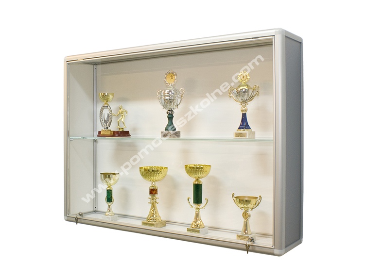 Gablota ekspozycyjna na puchary wykonana w całości z profili aluminiowych anodowanych. Narożniki gabloty plastikowe. Drzwi szkło akrylowe w ramie aluminiowej unoszone do góry, zamykane na dwa zamki. W zestawie 1 półka z grubego szkła szlifowanego w trzech płaszczyznach z możliwością regulacji wysokości. Pozostałe informacje: - w komplecie zestaw montażowy wraz z instrukcją - na szkle folia zabezpieczająca przed porysowaniem