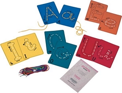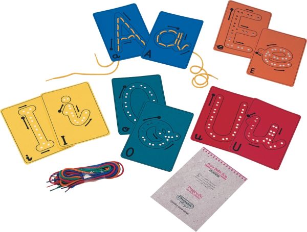 Duże i kolorowe karty z otworami i oznaczonym kierunkiem szycia. Stymuluje rozwój zdolności manualnych i naukę pisania liter.