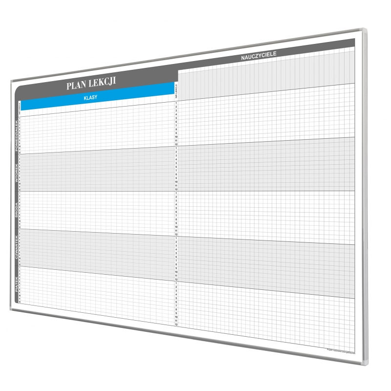 Tablica do układania planu lekcji z możliwością pisania markerami suchościeralnymi. Nadruk wykonany w technologii uniemożliwiające jego usunięcie. Oprawiony w ramę aluminiową anodowaną. Do układania planu lekcji służą kolorowe znaczniki magnetyczne. W komplecie znajduje się po 30 znaczników dla każdego nauczyciela.
