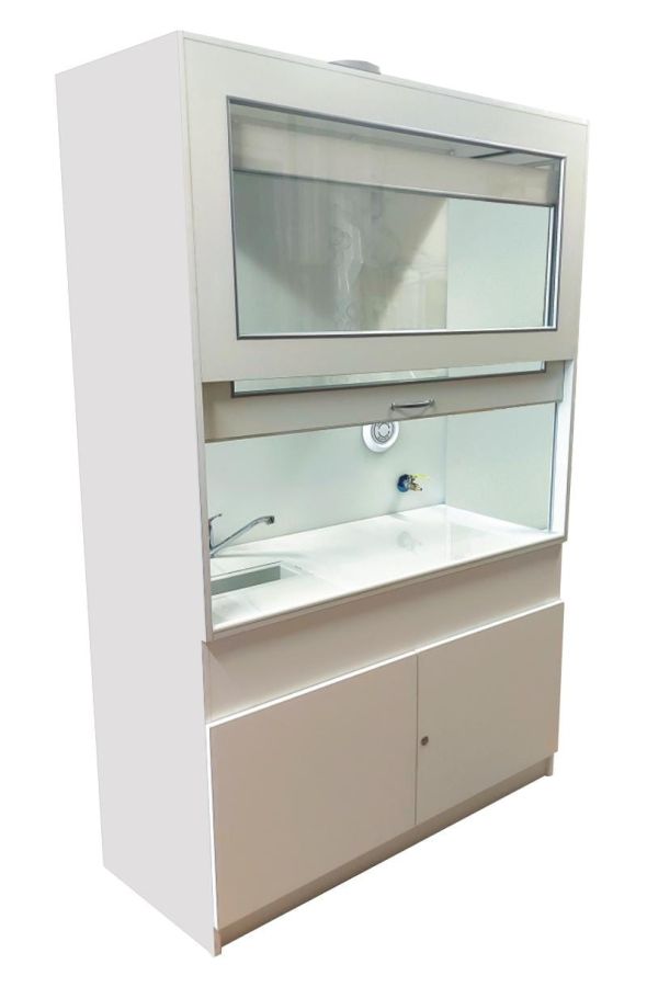 -górnej: komory manipulacyjnej oszklonej szybami hartowanymi, wyłożonej płytą polipropylenową odporną na kwasy i zasady do wysokości sufitu. Komora wyposażona jest w zlew polipropylenowy, baterię wodną, zawór gazowy, anemostat nawiewny. Blat wykonany w standardzie z litej ceramiki technicznej.