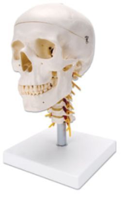 Czaszka człowieka z kręgosłupem. Czaszka umieszczona jest na szyjnym odcinku kręgosłupa. W kręgosłupie występuje rdzeń kręgowy, nerwy szyjne, kręgowe arterie, podstawowa arteria .. Czaszkę można zdjąć z stojaka.