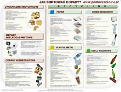 Ścienna plansza szkolna przedstawiająca główne zasady sortowania odpadów, tak aby umożliwić ich skuteczny recykling.