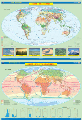 Na pierwszej stronie mapa główna Świat - Krajobrazy w skali 1:24 000 000, dodatkowo sześć zdjęć z przykładami krajobrazów. Na drugiej stronie mapa głowna "Świat - Strefy klimatyczne" w skali 1:24 000 000, dodatkowo 10 klimatogramów dla charakterystycznych stacji z każdej strefy. Format: 160 x 120 cm Skala: 1:24 000 000