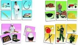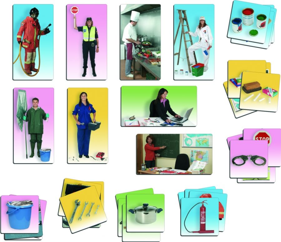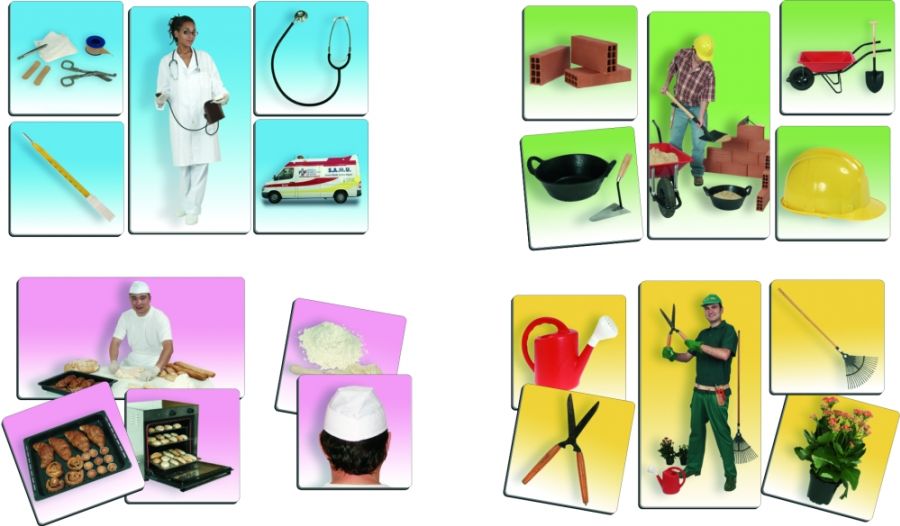 Zadaniem dziecka jest dopasowanie małych kart do dużych na których są namalowane postacie wykonujące różne zawody np: malarz, ogrodnik czy piekarz. Takich głównych kart jest 12. Do każdej z nich należy dopasować po 4 małe karty na których są namalowane narzędzia charakterystyczne dla danego zawodu np: do karty z ogrodnikiem należy dopasować 4 karty na których są narysowane: kwiaty,grabie,konewka czy sekator.