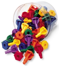 Zestaw składa się z 60 plastikowych tęczowych śrubek które kształtem doskonale dopasowują się do małej dłoni dziecka. Klocki najlepiej sprawdzają się w zestawie z tęczową układanką. Można je nakładać jeden na drugi. Całość jest zapakowana w plastikowym przezroczystym wiaderku.