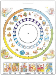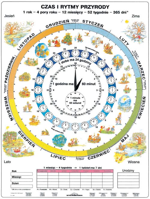 Czas i rytmy przyrody Plansza dwustronna 160x120cm.Zalaminowana ,oprawiona w drewniane półwałki i przygotowana do zawieszenia. Druga strona planszy przygotowana jest do ćwiczeń: godzin,miesięcy ,pór roku, dni tygodnia - kalendarz. Może pełnić rolę kalendarza klasowego.
