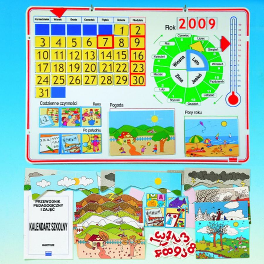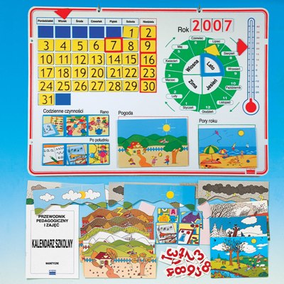 Praktyczny i trwały kalendarz pozwala zaznajomić dzieci z dniami tygodnia, miesiącami i zapisem daty. Na planszy znalazło się również miejsce na oznaczenie pory dnia, pory roku, pogody i temperatury oraz planowanych zajęć na przedpołudnie i popołudnie. Elementy ruchome wykonane są z grubej tektury i podklejone magnesami. Załączona instrukcja zawiera propozycje wielu ciekawych zajęć z wykorzystaniem kalendarza.