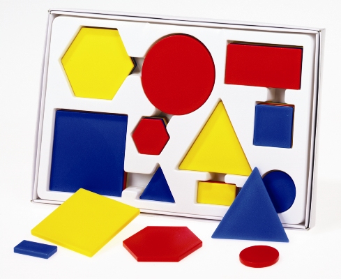 duże figury: kwadrat o boku 7,6 cm, koło o śr. 7,6 cm, trójkąt o boku 7,6 cm, prostokąt o wym. 7,6 x 3,8 cm, sześciokąt o boku 4 cm