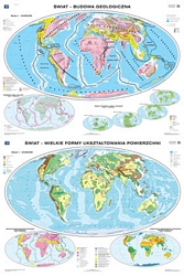 Na pierwszej stronie mapa główna "Świat - budowa geologiczna" w skali 1:24000 000, z mapą uzupełniającą "Trzęsienia ziemi, wulkany" w skali 1:60 000 000 oraz dodatkowymi czterema mapami. Druga strona zawiera mapę główną "Świat - wielkie formy ukształtowania powierzchni" w skali 1:24 000 000, z uzupełniającymi dwiema mapami w skalach. Format: 1600x1200