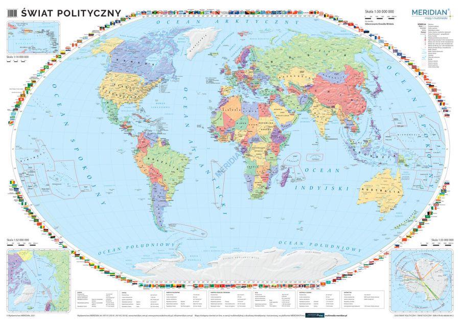 Mapa ukazuje aktualną sytuację polityczną świata, granice państw, granice sporne, a także granice stanów, prowincji i terytoriów. Mapa wzbogacona jest flagami państw oraz informacjami geograficzno-demograficznymi dla każdego kontynentu. W kartonach bocznych umieszczone są następujące mapy: