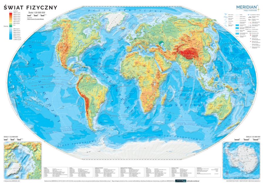 Ścienna mapa szkolna przedstawiająca ukształtowanie powierzchni świata. Klasyczna, poziomicowa mapa fizyczna została wzbogacona dodatkowo o informacje na temat ochrony środowiska. Umieszczone są na niej rezerwaty biosfery wpisane na światową listę dziedzictwa UNESCO, a ich lista wypisana jest pod mapą. W treści mapy znajdują się również prądy morskie, z podziałem na ciepłe i zimne, formy dna oceanicznego, punkty wysokościowe (góry, wulkany), głębokości, depresje, granice kontynentów, oceanów oraz podział na strefy czasowe.