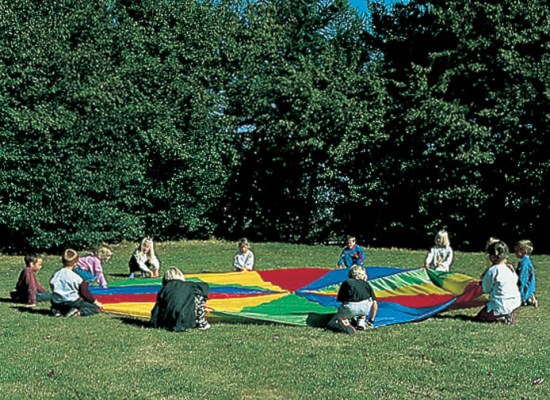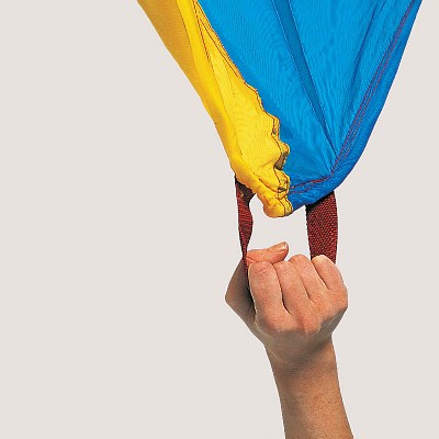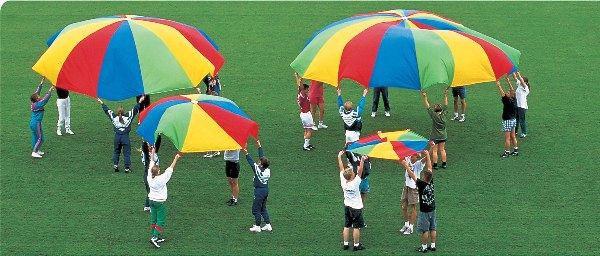 Kolorowe i lekkie spadochrony pozwalają organizować wiele zabaw integrujących grupę. Wielką chustę można podrzucać, można się pod nią chować, można być na niej zakręconym i odkręconym, można po niej przetaczać przedmioty ku sobie. Wspaniały przyrząd do ćwiczeń tak ciała, jak i ducha. Proponowane spadochrony posiadają określoną ilość ochwytów, jednakże na obrzeżach materiału wszyta jest lina o średnicy 1 cm - tak więc liczba osób mogących brać udział w pysznej zabawie jest praktycznie nieograniczona.
