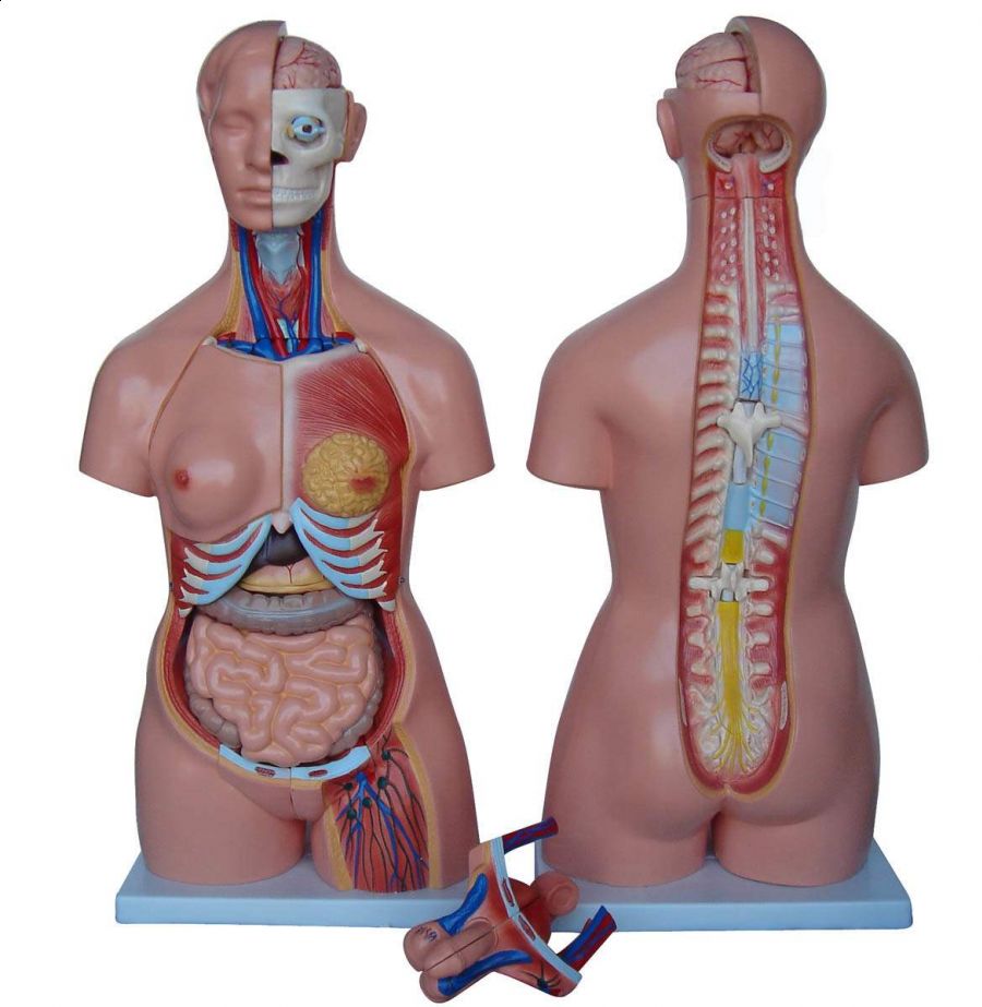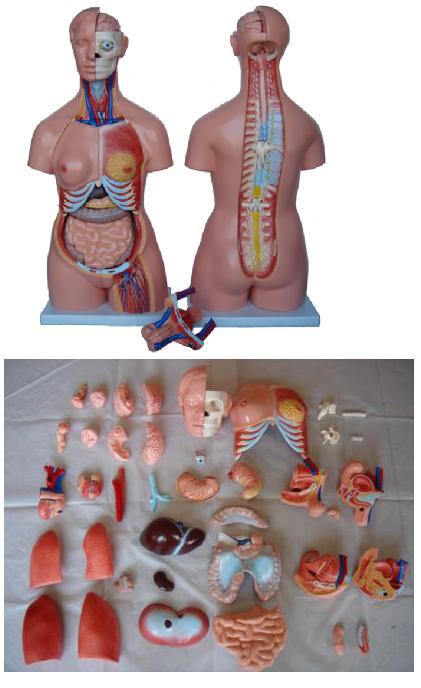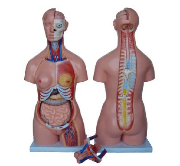 Model anatomiczny (40 – częściowy) wykonany ze sztucznego ulepszonego tworzywa, umieszczony na podstawie; lewa strona modelu przedstawia układ mięśni i ścięgien. Przednia część klatki piersiowej jest zdejmowana (na klatce piersiowej przedstawiona budowa gruczołu piersiowego); możliwe jest wyjęcie każdego z organów i bezpośrednie zapoznanie się z jego budową;
