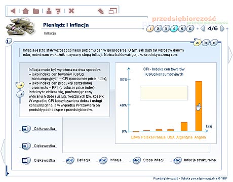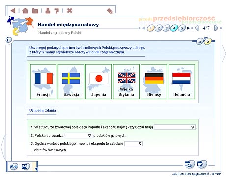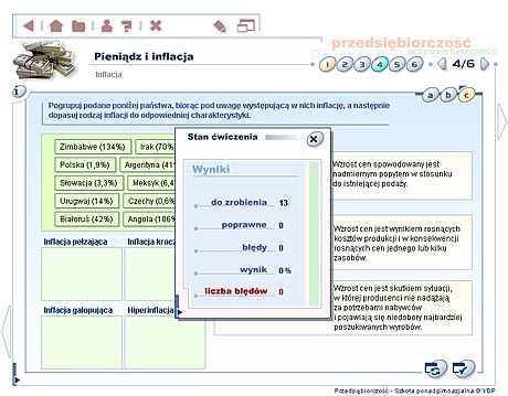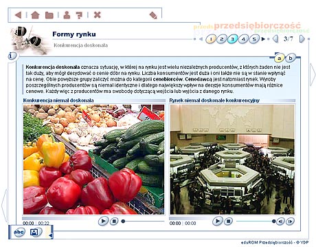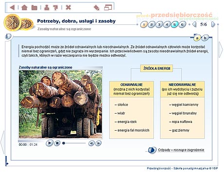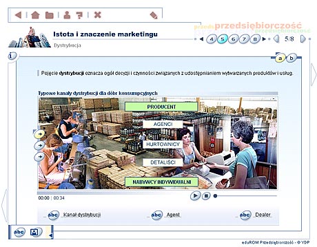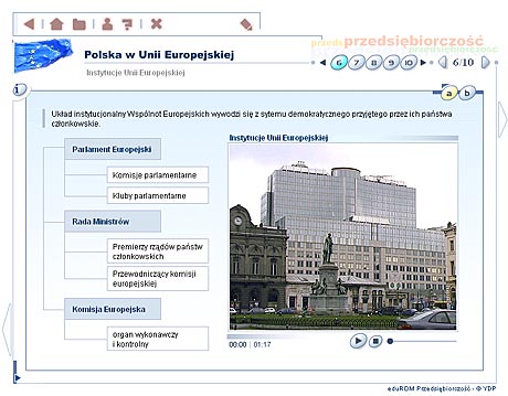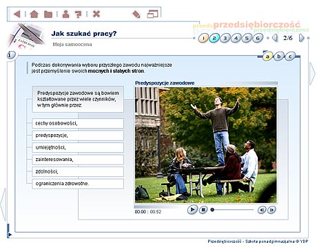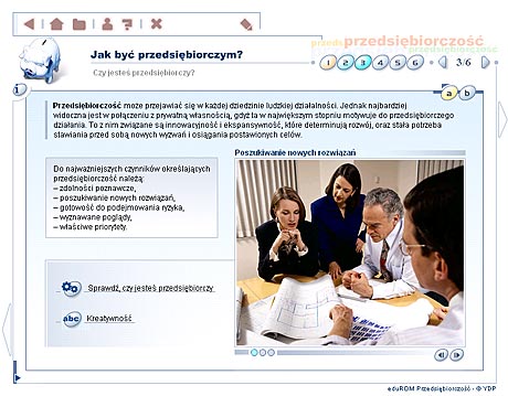 Przedsiębiorczość - szkoła ponadgimnazjalna Multimedialne lekcje – Przedsiębiorczość to edukacyjny program komputerowy, obejmujący podstawowe zagadnienia z zakresu nauczania przedsiębiorczości w szkole ponadgimnazjalnej. Multimedialny przekaz informacji w formie narracji, animacji, zdjęć, ilustracji oraz symulacji sprawia, że przyswajanie wiedzy z dziedziny przedsiębiorczości staje się dużo wygodniejsze i bardziej efektywne. Materiał dydaktyczny Program ma za zadanie rozwinięcie w uczniu cech osoby przedsiębiorczej, która będzie potrafiła dobrze funkcjonować w warunkach gospodarki rynkowej, odpowiednio ocenić swoje możliwości i umiejętnie wykorzystać zdobytą wiedzę. Tradycyjny wykład został wzbogacony m.in. o filmy animowane i wideo, a także interaktywne ćwiczenia oraz prezentacje. Materiał dydaktyczny zawarty w programie EduROM Multimedialne lekcje - Przedsiębiorczość odpowiada co najmniej 60 godzinom efektywnej nauki. Zgodny jest także z podstawą programową zatwierdzoną przez MEN. Elastyczny tryb nauki – program dopasowujący się do umiejętności ucznia Podczas wykonywania ćwiczeń system analizuje stan wiedzy ucznia oraz dostosowuje materiał do jego umiejętności i wiadomości w taki sposób, aby zwiększyć skuteczność nauki. Uczeń słabszy, który gorzej radzi sobie z wybranymi ćwiczeniami, jest wspierany podpowiedziami naprowadzającymi na właściwą odpowiedź. Uczeń, który lepiej radzi sobie z zadaniami, rozwiązuje ćwiczenia trudniejsze. Taki system pozwala na indywidualizację i precyzyjne dopasowanie procesu nauczania do potrzeb każdego ucznia. „Inteligentne” ćwiczenia – system kontroli postępów w nauce Każde ćwiczenie zawiera komentarz zwrotny (w formie dźwiękowej, tekstowej i graficznej) lub tzw. komentarz okienkowy (dodatkowa prezentacja w postaci tekstu, tabeli, ilustracji). Szczegółowy raport wyników, przypisany do każdego ćwiczenia, umożliwia analizę sposobu jego wykonania – wskazuje m.in. ile razy użytkownik korzystał z podpowiedzi, ile popełnił błędów, zanim poprawnie rozwiązał całe zadanie. Raport nie może też zostać wyzerowany, co motywuje użytkownika do udzielania przemyślanych odpowiedzi. Przewodnik – jak pracować z programem efektywnie Strona tytułowa każdej lekcji zawiera informacje o jej celach oraz zakresie wiedzy niezbędnym, aby zrozumieć daną lekcję i poprawnie wykonać zawarte w niej ćwiczenia. Na kolejnych stronach umieszczono dokładne wskazówki, jak efektywnie pracować z materiałem szczegółowym. Praca z programem nie powinna więc sprawiać użytkownikowi najmniejszego problemu. Narracje i filmy W programie eduROM Multimedialne lekcje - Przedsiębiorczość dostępne są narracje i filmy, dzięki którym poznawanie m.in. zasad funkcjonowania gospodarki rynkowej, negocjacji oraz komunikacji staje się prostsze i ciekawsze. Programy narzędziowe Szybkiemu zapamiętywaniu przekazywanych wiadomości oraz ich systematyzacji służą specjalne programy narzędziowe: