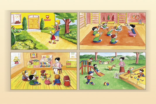 1. Historyjka obrazkowa - „Jeden dzień Zosi w przedszkolu”. Pomoc zawiera 11 plansz: