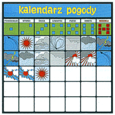 Pomoc przeznaczona do edukacji wczesnoszkolnej i przedszkolnej. Kalendarz wykonany jest ze sztywnego kartonu o wymiarach 70cm x 70cm. Górna część planszy zawiera nazwy kolejnych dni tygodnia, pozostałe pola w formie kwadratów to miejsca, w które umieszcza się symbole pogody. Wzorów określających stan pogody jest piętnaście. Uwzględniają one prawie wszystkie możliwości atmosferyczne występujące w naszym kraju w ciągu całego roku.