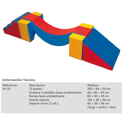 W skład zestawu wchodzi 5 elementów : 2 podstawy H - 60x50x30cm, Most-wysoki 165x30x50cm , Rampa -zjazd 60x60x45cm , Schody 60x60x45cm . Całość na wymiar : 285x60x50cm.