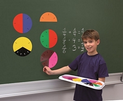 Komplet 9 kół podzielonych na części ułamkowe. Każdy element jest dwustronnie kolorowy i opisany: z jednej strony ułamkiem zwykłym, a z drugiej - ułamkiem procentowym. W zależności od sytuacji nauczyciel może moderować na tablicy ćwiczenia do wykonywania przez uczniów na kołach uczniowskich (jeśli posiadamy w klasie), albo demonstrować zagadnienia ułamkowe i zapraszać uczniów do tablicy.