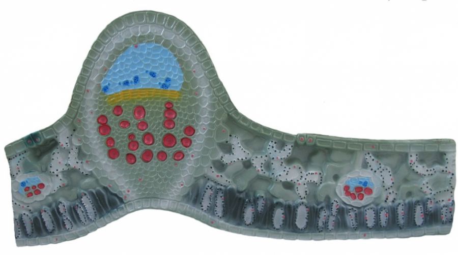 Duży, przestrzenny model liścia, doskonale obrazujący poszczególne warstwy komórek w tym organie. Na kolorowo oznaczony przekrój wiązki przewodzącej. Model przedstawia przekrój poprzeczny i podłużny - z dużą dokładnością i trójwymiarowym zarysem morfologicznym. Niezbędna pomoc dydaktyczna w pracowniach biologicznych i botanicznych