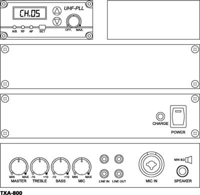 Odpowiedni mikrofon lub nadajnik kieszonkowy: TXA-800HT lub TXA-800HSE są dostępne jako wyposaż. dodatk. Tastenwelt 02/2008 odnośnie TXA-800 "W pełni zadowalający, zrównoważony dźwięk, możliwość połączenia audio z TXA-802CD."