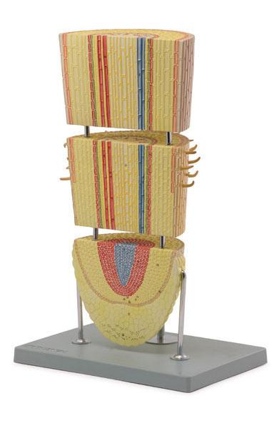 Model 200-krotnie powiększony, przedstawia strukturę typowego korzenia . Model podzielony na 3 segmenty, w tym: strefa pierwotnej struktury komórek poszerzenie strefy i strefy merismatics. Wszystkie inne struktury i rodzaje komórek są ponumerowane.