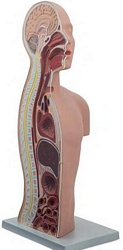 Model 3-wymiarowy, 2-stronnie, ręcznie malowany. Z jednej strony, pokryty przezroczystą pokrywą, pokazuje strzałkową sekcje w tym nosa, jamy ustnej, krtani, tchawicy, przełyku, płuc i żołądka. Z drugiej strony przedstawia anatomicznie prawidłowe widzenie ludzkiego tułowia dla nauczania właściwej metody pomiaru rur NG długości. Tułów spełnia funkcje tracheostomii oraz pokazuje różnorodne techniki opieki.