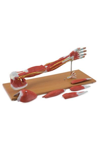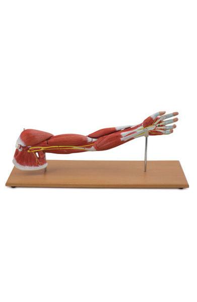 7 częściowy model naturalnych rozmiarów, przedstawiający anatomiczną strukturę ramienia, zewnętrzne i osadzone głębiej mięśnie, struktury naczyniowe, nerwy i wiązadła.