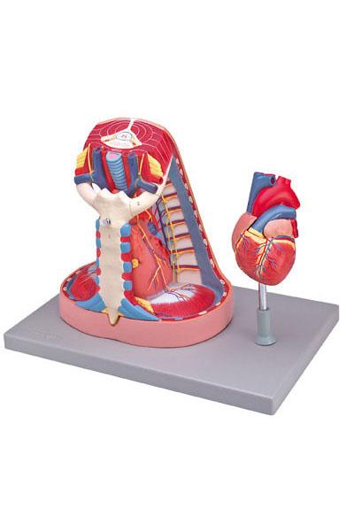 Model naturalnej wielkości, składa się z 5 części, w tym 2 części serca , która stanowi widok wnętrza komór i zawory. Mostek i grasica są ruchome,pokazane główne naczynia płucne. W tchawicy i przełyku są widoczne wejścia śródpiersia przez  otwór klatki piersiowej.