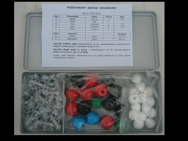 Zestaw zawiera 104 elementy, w tym modele takich pierwiastków jak węgiel, wodór, tlen,azot i chlor oraz 2 rodzaje łączników (sztywne i giętkie) symbolizujących różne wiązania (m.in. pojedyncze kowalencyjne, wodorowe i inne)