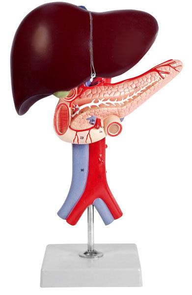 Naturalnej wielkości model, 2-częściowy, pokazuje wątrobę z pęcherzykiem żółciowym, trzustką i dwunastnicą w przekroju, który obrazuje żyły :główną dolną, aortę brzuszną i przewody trzustkowe.