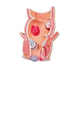 1-częściowy model, powiększony 5-krotnie, pokazuje różne patologie odbytnicy i odbytu. Pokazano :hemoroidy, przetoki ,szczeliny odbytu, 2 rodzaje ropni . Model pokazuje wrzodziejące zapalenie jelita grubego, polipy oraz  raka odbytnicy.
