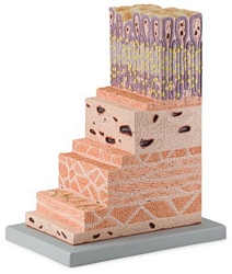 1-częściowy model, w powiększeniu 150X  jest przydatny w przedstawieniu budowy struktury ścianek żołądka. Wszystkie  warstwy są zaprezentowane z dużą dokładnością i szczegółowością. Główne struktury, w tym różne typy komórek, naczynia włosowate i limfatyczne są ponumerowane i opisane dodatkowo na załączonej ulotce.