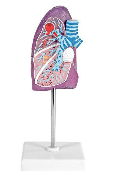 1-częściowy model powiększony 2/3 razy model przedstawia patologię systemu płucnego spowodowane infekcjami mikro organicznymi ( ropień płucny, zapalenie płuc, gruźlica). Czarna powierzchnia modelu uwydatnia widoczny efekt palenia. Model pokazuje również zmiany nowotworowe. Wszystkie choroby są przedstawione osobno.