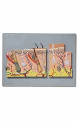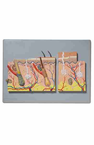 70- krotnie powiększony model porównuje część owłosioną skóry do części bez włosów. Wszystkie struktury, w tym wrażliwe krwinki, mieszki włosowe, sebacoeus i gruczoły potowe, są pokazane szczegółowo.