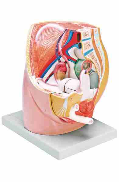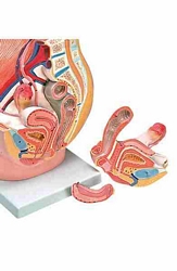 Naturalnego rozmiaru model rozcięty wzdłuż płaszczyzny przyśrodkowej, strzałkowej miednicy. Ukazuje wewnętrzne narządy żeńskiego układu moczowego i rozrodczego.