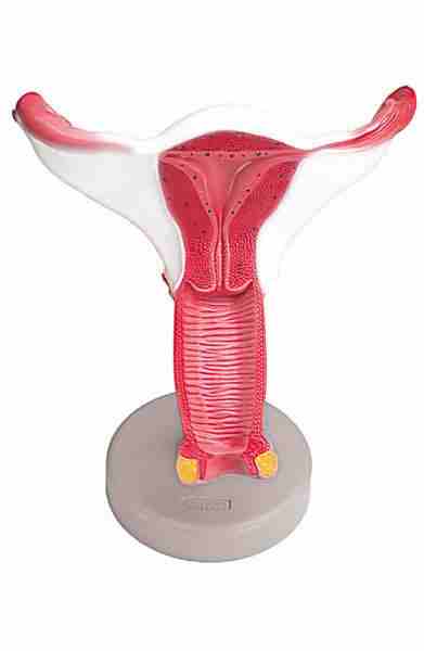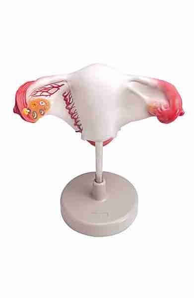 Model w 1,5 - krotnym powiększeniu, przedstawia otwartą pochwę, szyjkę macicy, macicę, jajnik. W jajniku pęcherzyk jajnikowy w różnych fazach.