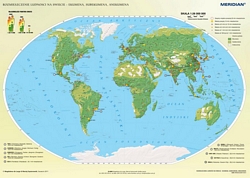 Ścienna mapa przedstawiająca rozmieszczenie ludności na świecie, istotnie zagadnienie z niezwykle dynamicznej dziedziny geografii jaką jest demografia. Na tle stref ekumeny, subekumeny i anekumeny pokazane jest umiejscowienie skupisk ludności powyżej 100 000 mieszkańców oraz najważniejsze aglomeracje naszego globu.