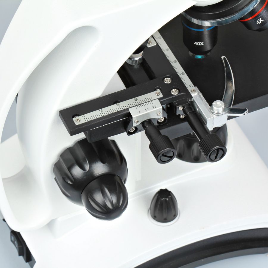 stolikiem mechanicznym, z możliwością precyzyjnego przesuwu preparatu, z naniesioną podziałką - zdecydowanie ułatwia to pracę młodemu użytkownikowi z preparatem w stosunku do mikroskopów z łapkami tylko trzymającymi preparat