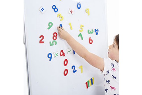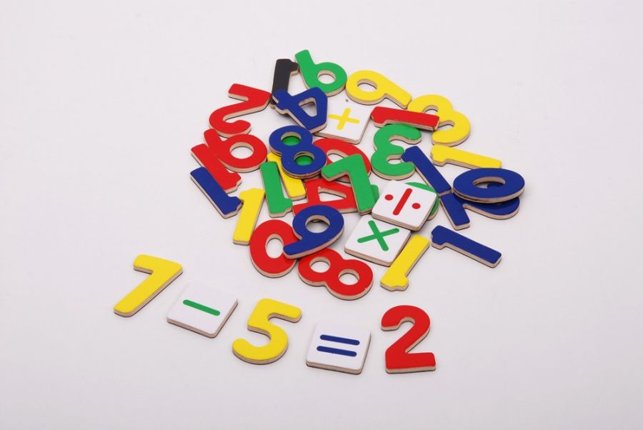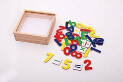 Kolorowe cyferki magnetyczne wielkości 4,4cm + znaki działania w pudełku drewnianym