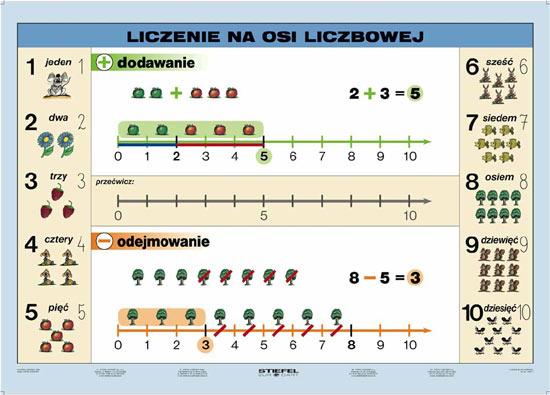 Liczenie na osi liczbowej cz. I plansza jednostronna 140x100cm , zalaminowana,oprawiona w drewniane półwałki,gotowa do zawieszenia. Bardzo dobra jakość wykonania.