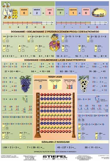 Plansza - plus / minus Uczymy się dodawać i odejmować. plansza dwustronna 140x100cm , zalaminowana,oprawiona w drewniane półwałki,gotowa do zawieszenia. Bardzo dobra jakość wykonania.
