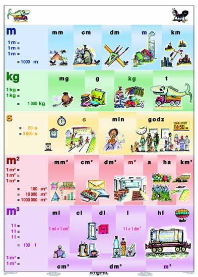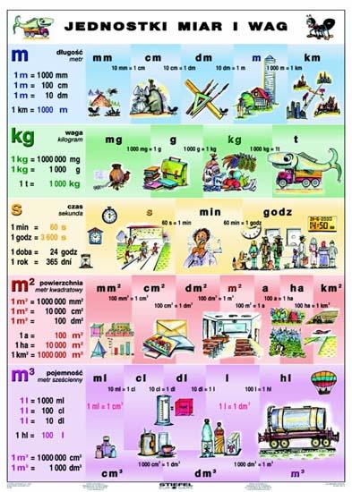 Jednostki miar i wag plansza 140x100cm,dwustronna - nowość !! . Ciesząca się dużą popularnościa plansza w szkołach podstawowych . Zalaminowana ,oprawiona w drewniane półwałki i przzygotowana do zawieszenia. Pierwsza strona- podstawowe jednostki miar i wag . Druga strona - ćwiczeniowa do pisania pisakami.