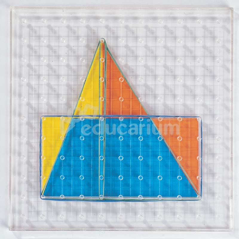 Geoplan z wysokiej jakości tworzywa. Wykonywanie ćwiczeń na geoplanie jest aktywną i lubianą przez uczniów formą nauki geometrii. Manipulacja gumką na kołeczkach geoplanu dostarcza uczniom praktycznej wiedzy w zakresie budowy, kształtu, własności i wzajemnych relacji pomiędzy poszczególnymi figurami geometrycznymi.
