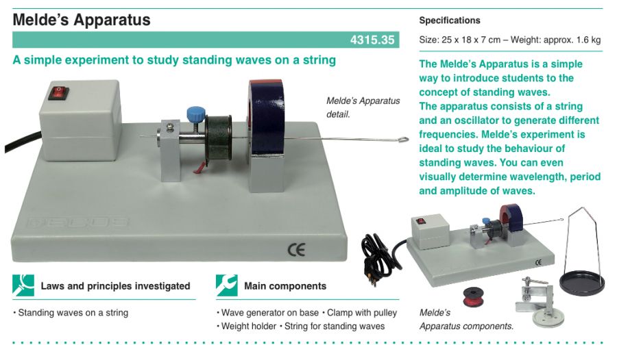 Aparat Meldego pozwala na wprowadzenie pojęcia fal stojących. Aparat składa się z linki i generatora, który wytwarza drgania o różnej częstotliwości. Doświadczenie Meldego jest szczególnie przydatne do badania zachowania fal stojących. Pozwala określić wzrokowo długość fali, okres oraz amplitudę.
