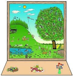 Pomoc przedstawia widok z okna o każdej porze roku, który zawiera stałe elementy krajobrazu: drzewo (kasztanowiec), staw, wzgórze, ławkę i w oddali las. Zmienia się jedynie szata roślinna, barwy, przedstawione postacie wykonują różne czynności, ubrane są w inne stroje. Widoczne są różne gatunki zwierząt, zmienia się kolor nieba.