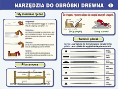 Pakiet zawiera 8 tablic informacyjnych :  Materiały i przybory rysunkowe,  Narzędzia do obróbki drewna,  Budowa roweru,  Właściwości i zastosowanie drewna,  Surowce papiernicze i ich przeróbka,  Podział włókien i ich pochodzenie  Sprzęt gospodarstwa domowego.  Oświetlenie,  Obwody elektryczne.