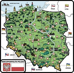 - krainy geograficzne z ilustracjami gór, wyżyn, nizin i pojezierzy,