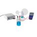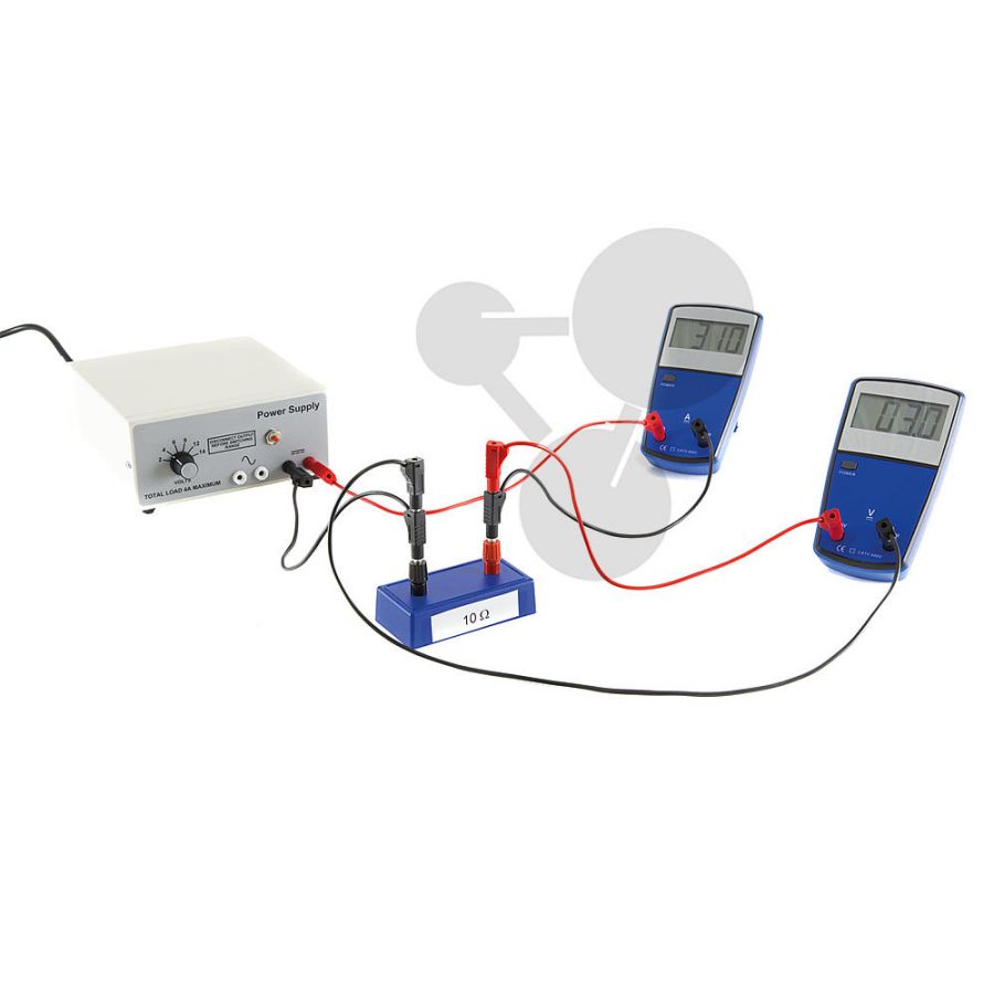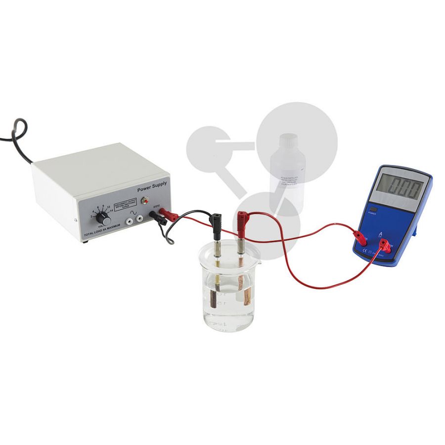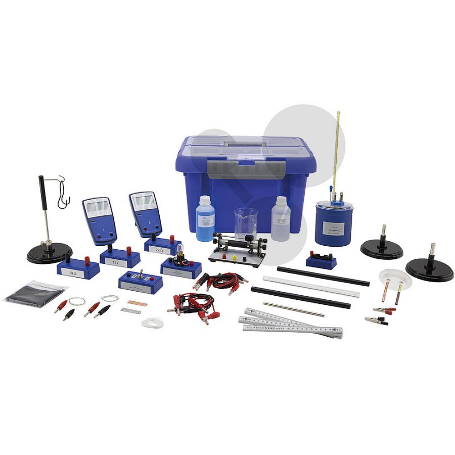 Statyw, 1 calówka, 1 pręt akrylowy, 2 pręty z PCV, 1 przełącznik, 1 oprawka na lampę, 1 żarówka 6 V, 4 przewody do doświadczeń (30 cm), 4 przewody do doświadczeń (60 cm), 2 zaciski krokodylowe, 2 druty NiCr, 1 uchwyt z elektrodami miedzianymi i mosiężnymi, 1 zestaw rezystorów, 1 opornica suwakowa (10 Ω), 1 uchwyt na baterie, 1 cyfrowy woltomierz, 1 cyfrowy amperomierz, 1 zlewka (250 ml), 1 butelka siarczanu miedzi, 1 butelka wody destylowanej, zestaw dostarczany w walizce z tworzywa sztucznego z opisem doświadczeń.