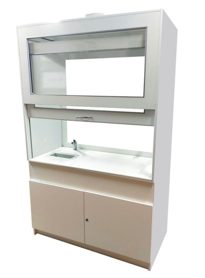 W górnej komorze zamocowana jest przesuwana okiennica podnoszona za pomocą systemu „Fennel”. Pozwala on na ustawienie okiennicy (góra-dół) w dowolnym położeniu. Wentylator z płytą montażową stanowi wyodrębnioną część wyciągu do montażu na otworze kominowym. W standardzie wentylator kanałowy o mocy 350-500 m3/h dwubiegowy. Instalacja wyciągowa wykonana jest z polistyrenu w wersji podstawowej. Króciec wyciągowy na suficie fi 150mm. Dygestorium chemiczne Pro-III posiada system wentylacji wywiewny. Całość na nośniku płyty laminowanej. Nóżki regulacyjne niewidoczne z zewnątrz, umożliwiają wypoziomowanie urządzenia. Dygestorium jest dostępne w trzech kolorach: biały, buk, popiel. Dodatkowe kolory na specjalne zamówienie.