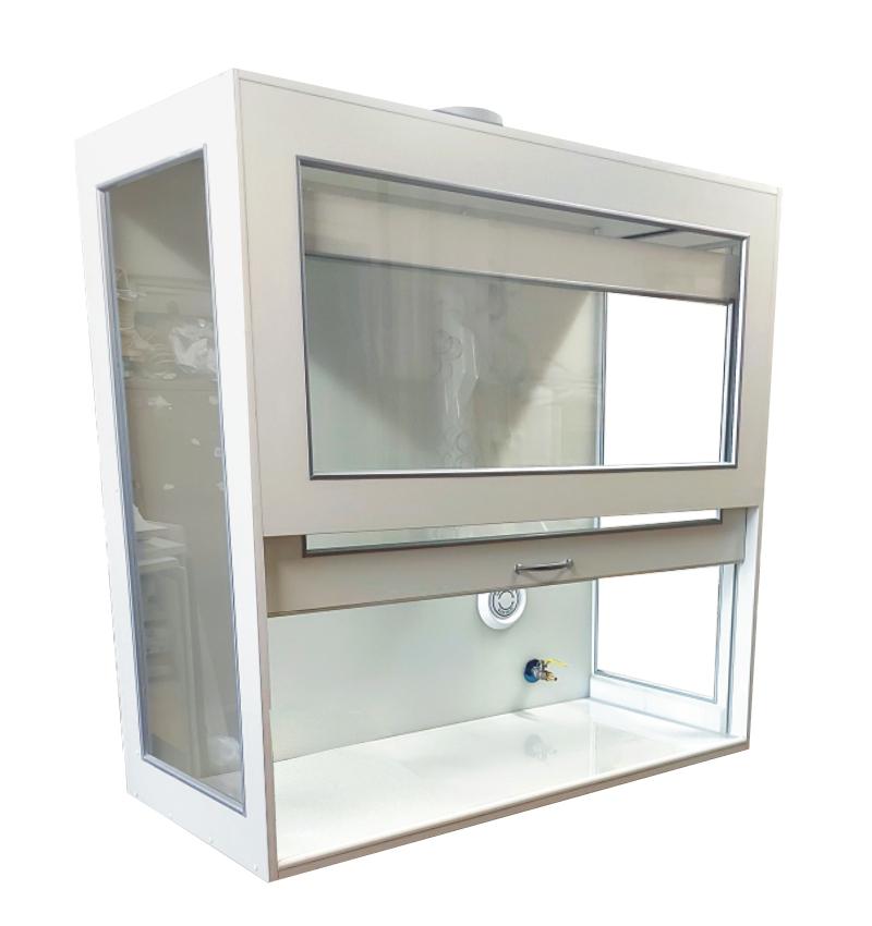 W komorze zamocowana jest przesuwana okiennica podnoszona za pomocą systemu „Fennel”. Pozwala on na ustawienie okiennicy (góra-dół) w dowolnym położeniu. Dygestorium w standardzie posiada wentylację wywiewną sufitową. Wentylator z płytą montażową stanowi wyodrębnioną część wyciągu do montażu na otworze kominowym. W standardzie wentylator kanałowy dwubiegowy o mocy 350-500m3//h. Króciec wylotowy wentylacji fi 150mm. Instalacja wyciągowa wykonana jest z polistyrenu w wersji podstawowej. Całość na nośniku laminatu. Dygestorium nastołowe jest dostępne w trzech kolorach: biały, buk, popiel.